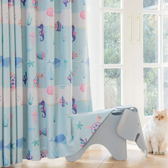 Ce rideau occultant pour chambre bébé crée une ambiance douce et rassurante grâce à son bleu océan apaisant et ses adorables motifs de tortues, hippocampes, poissons et coraux. Conçu pour favoriser un sommeil paisible, il filtre efficacement la lumière et apporte un vrai confort visuel.