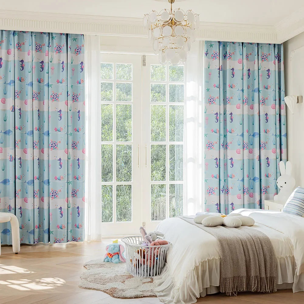 La couleur bleue et les motifs marins apportent une touche rêveuse qui stimule l’imagination tout en créant un cadre sécurisant. Que ce soit pour une chambre bébé, une chambre mixte ou un espace de jeu, ce rideau pour enfant ajoute une note de poésie tout en restant pratique, résistant et simple à installer.