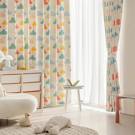 Ce rideau pour chambre bébé apporte une atmosphère douce et joyeuse grâce à ses motifs nuages colorés, parfaitement adaptés à une décoration enfantine moderne. Conçu en 100% polyester, il offre un tombé souple et harmonieux tout en laissant passer une lumière tamisée idéale pour créer un espace de repos apaisant.