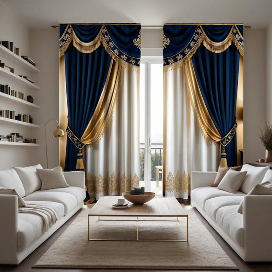 Avec son jeu de couleurs bleu nuit et or, ce rideau incarne l'harmonie parfaite entre élégance classique et charme intemporel. Sa présence dans un salon, une chambre ou même une cuisine, confère un caractère unique et une atmosphère noble qui captent immédiatement le regard.